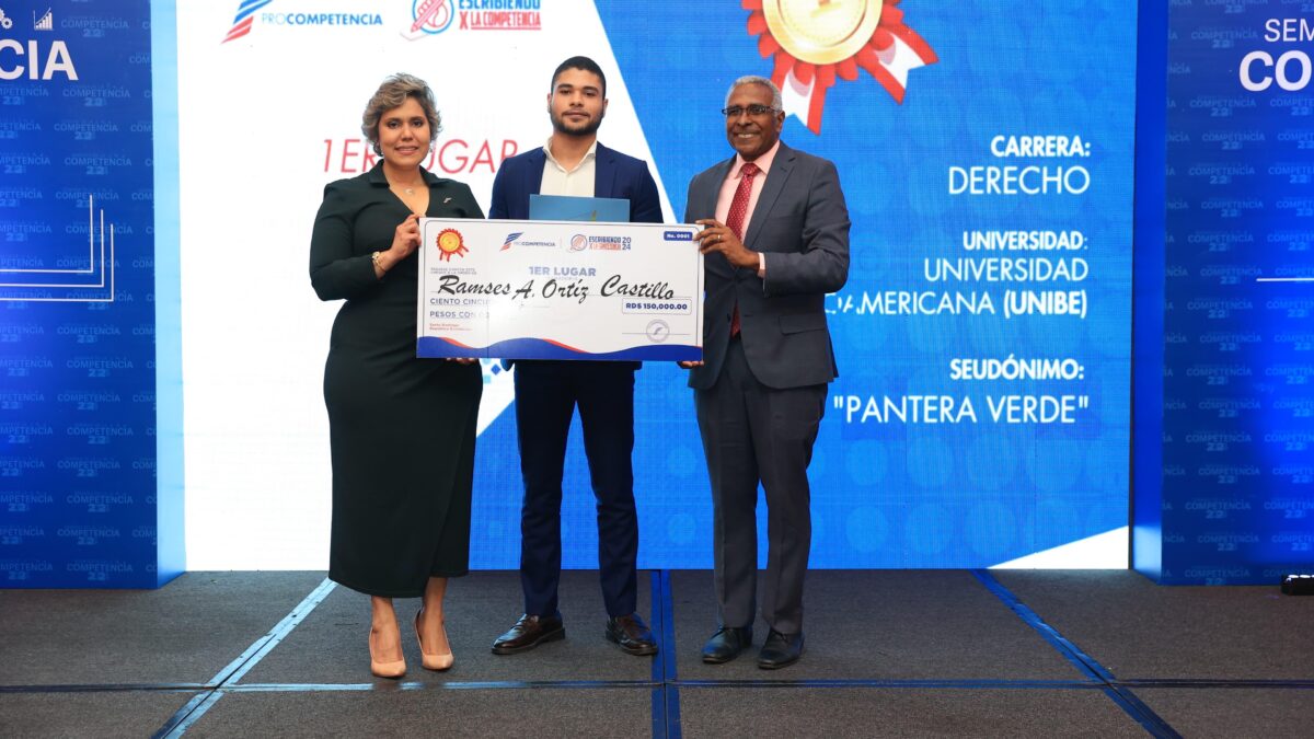El primer lugar del concurso “Escribiendo X la Competencia” lo obtuvo Ramsés Antonio Ortiz Castillo, estudiante de Derecho de la Universidad Iberoamericana (UNIBE), por su trabajo “Nuevas armas competitivas en la era del ASG: Un estudio crítico sobre el greewashing y la integridad empresarial”, por lo que fue premiado con RD$150,000.