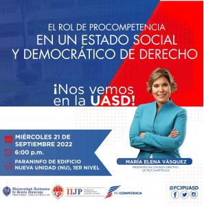 SANTO DOMINGO, D.N. “El rol de la Comisión Nacional de Defensa de la Competencia en un Estado social, democrático de derecho” es el tema de la conferencia que expondrá en la Universidad Autónoma de Santo Domingo la presidenta del Consejo Directivo de la institución estatal, profesora María Elena Vásquez.